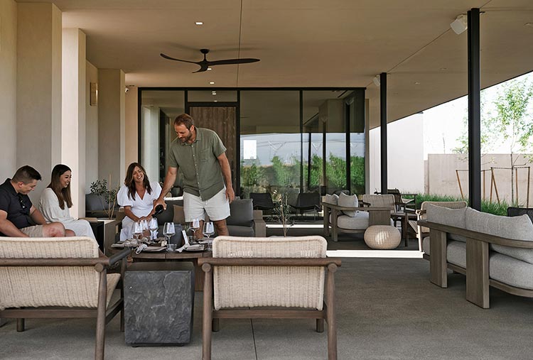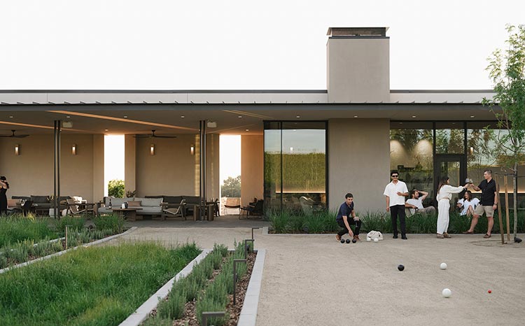 The place has a timeless and natural quality. Guests can flow at an unhurried pace into the garden and terrace, offering a wine tasting experience amid tree-shaded seating, an outdoor kitchen, and a bocce court.